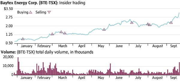 The oil patch is back with a vengeance. In our September Top 40 Stock Report, half the list is from the energy sector. Throughout the past few months in INK reports, we have encouraged investors to consider the value proposition of Canadian energy stocks. For example, in the spring, here we highlighted insider buying at Baytex Energy Corp. as the stock rallied. As it consolidated this summer, insiders continued to buy. The most recent buyer was chief executive officer Edward LaFehr, who picked up 15,000 shares at $2.28 on Sept. 9.