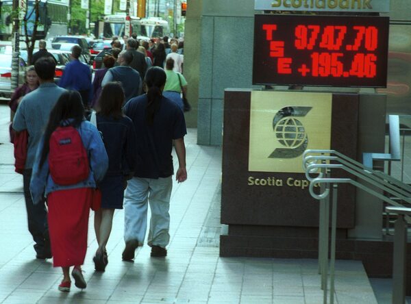 Pedestrians pass by signage with TSE market numbers on display in June 2000.Tibor Kolley/The Globe and Mail