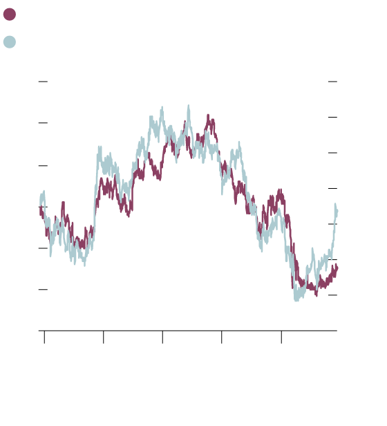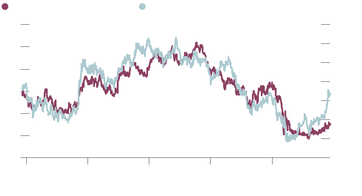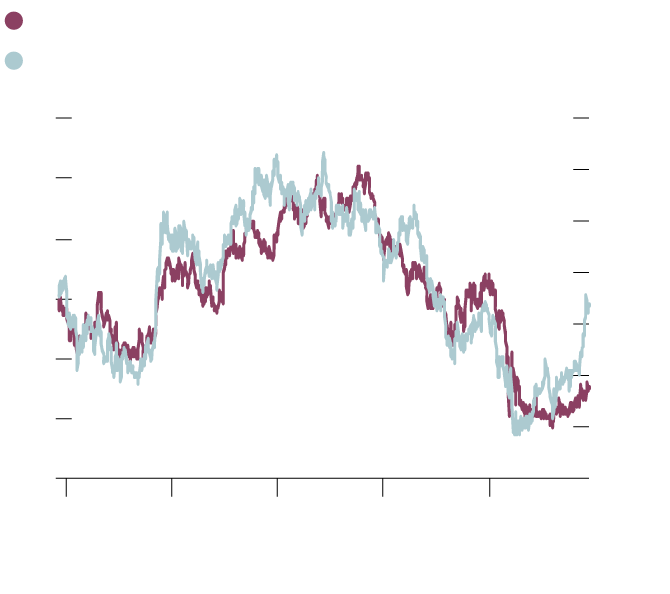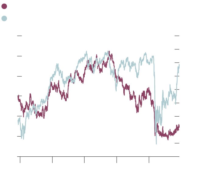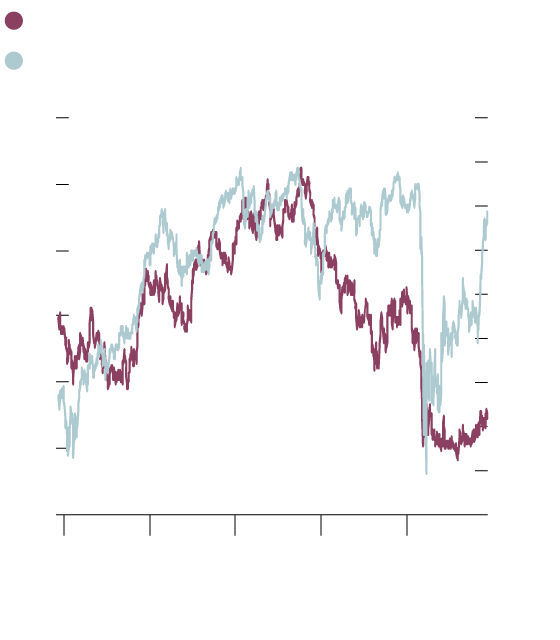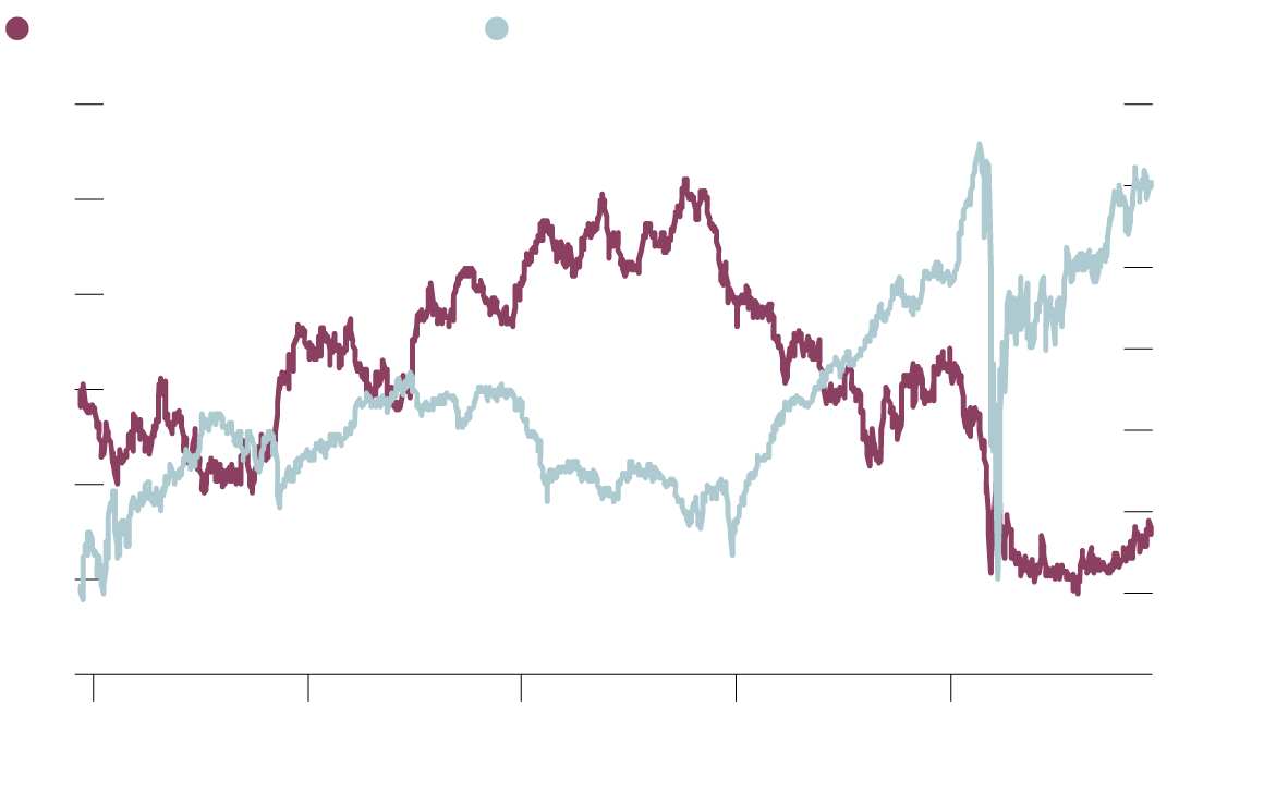 The second chart compares the S&P/TSX Banks Index with the 10-year government of Canada bond yield. Bank stocks have tracked the bond yield relatively closely in the past five years with the notable exception of the 14 months leading up to the pandemic.