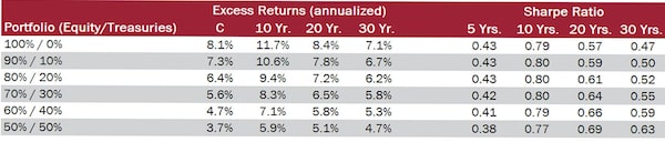 We wanted to demonstrate how adding Treasuries to the asset mix can improve the risk-adjusted return, thus showing how bonds can be a ballast in the portfolio. To do so, we looked at annualized excess returns from the past five, 10, 20, and 30 years of a simple mix of 100 per cent stocks, 90 per cent stocks/10 per cent Treasuries, 80/20, 70/30, 60/40, 50/50 and divided each by their respective volatilities over the same timeframe. Take a look at the accompanying table for the results.