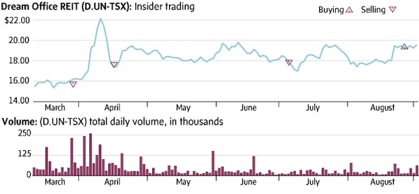 Insider buying has helped to lift Dream Office REIT (D-UN-T) up the INK Edge rankings into mostly sunny, putting it in the top 30 per cent of all stocks ranked on the basis of value, insider commitment and price momentum. As of mid-week, its 5.1-per-cent prospective annual yield beat the Bank of Canada rate of 4.25 per cent. Meanwhile, on Aug. 28, Trustee Jane Gavan bought 14,700 Series A trust units at $19.39. Finally, price performance over the past 6-months has been strong with units up about almost 26%.