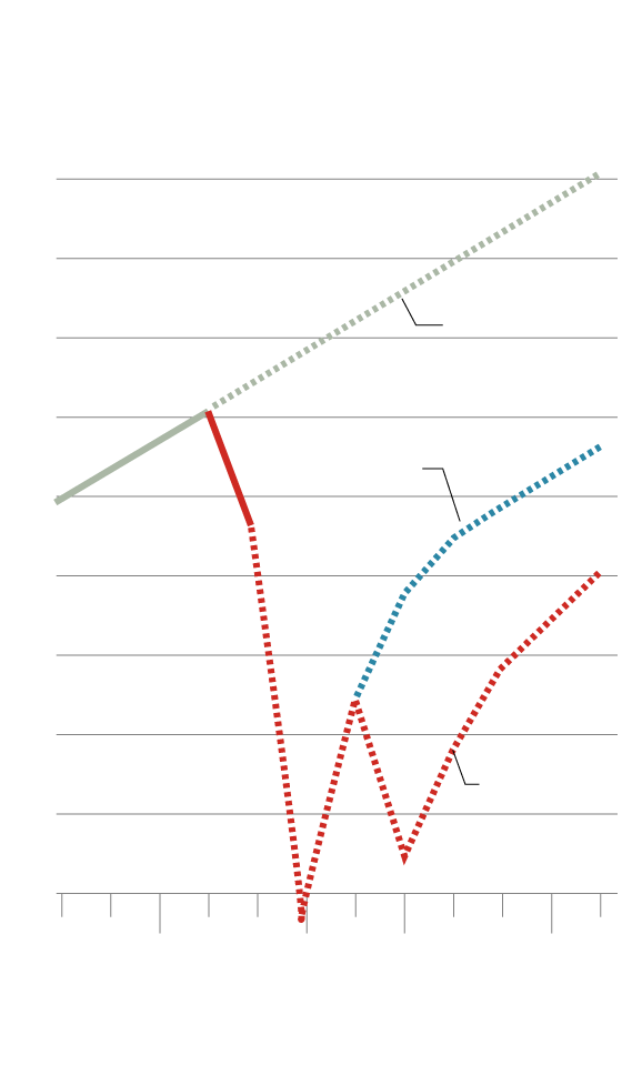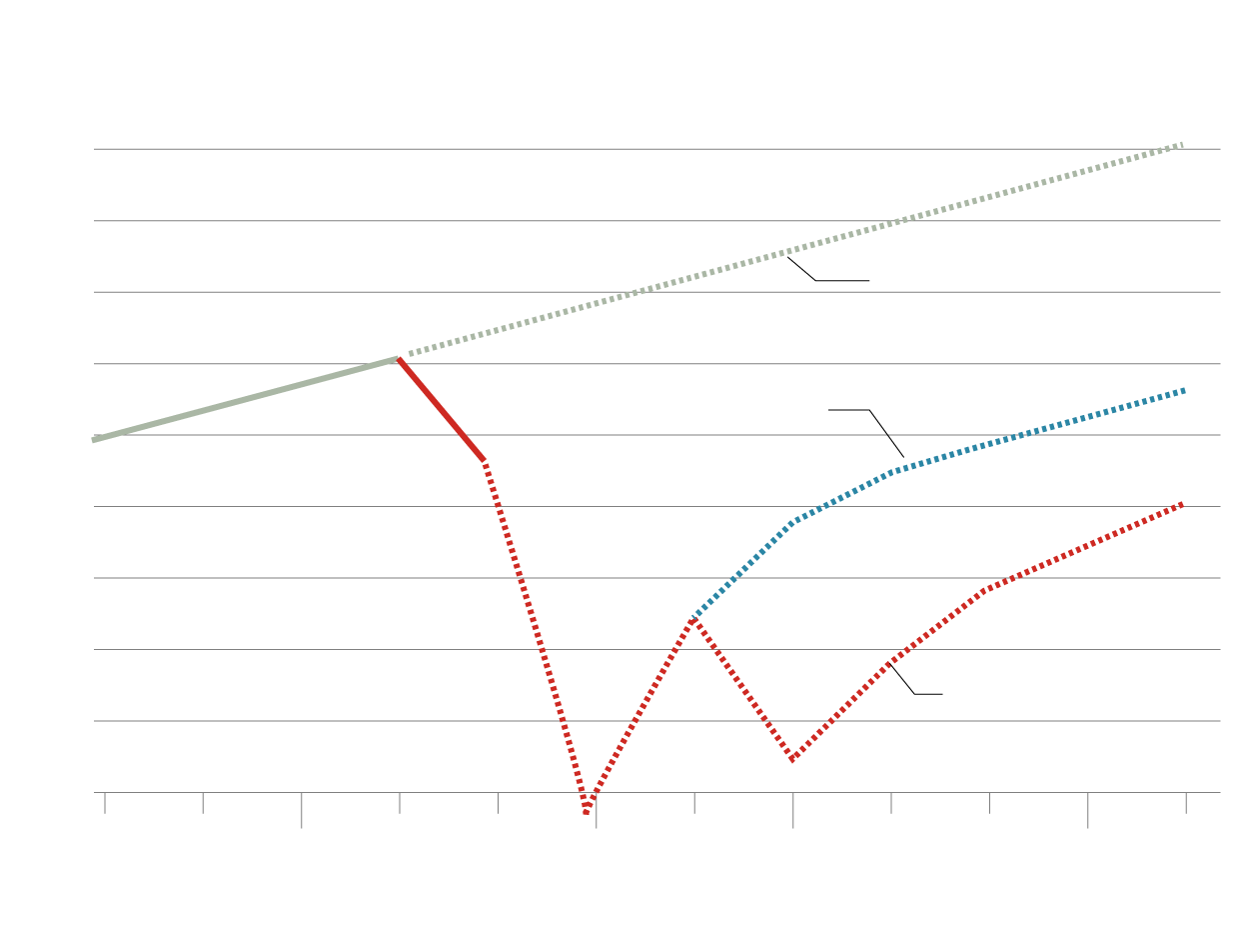 In both cases, the global economy doesn’t recover its prepandemic level for at least two years. But in the double-hit scenario, the shortfall is far deeper and persists much longer.