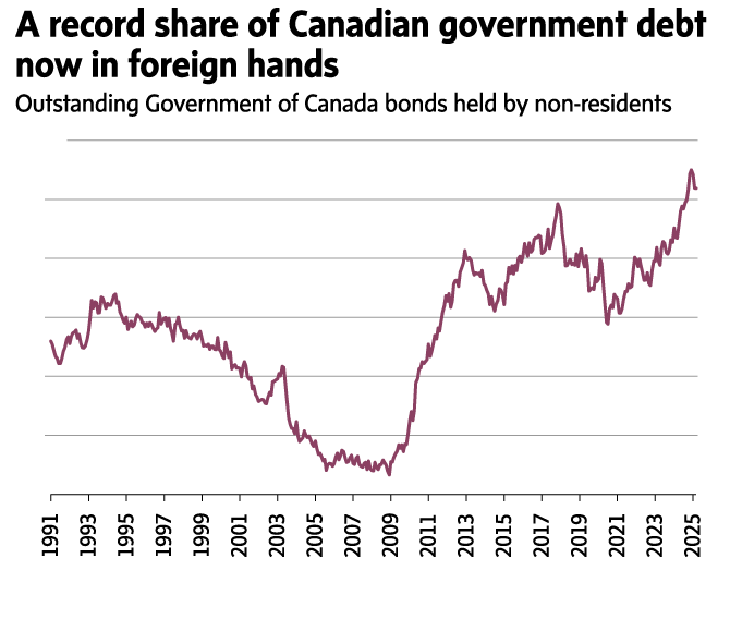 That’s not a huge number, but it is a big change in trend. International investors up to that point were ravenous for Government of Canada debt, absorbing 60 per cent of net new supply for a record $91-billion in fiscal 2024-25.