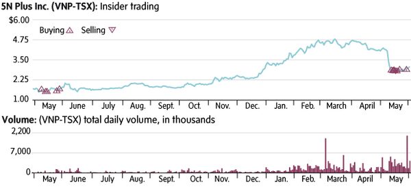 5N Plus Inc. focuses on specialty materials for aerospace, other electronic and economy-friendly applications. The stock is up about 55 per cent since we highlighted it for clients on June 5 of last year. However, at one point it was up 150 per cent as it hit a 52-week high of $5.01 in March. The stock fell a bit closer to Earth after it reported quarterly results on May 10. Insiders bought the pullback following the news, spending net $568,037 buying shares in the public market.