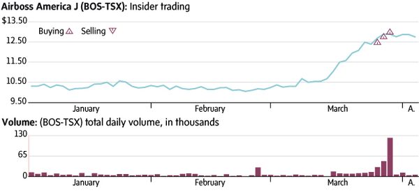 In addition, on March 27, Gordon Flatt, who holds a 10-per-cent stake, acquired 100,000 common shares at a price of $12.85 (not shown on chart).