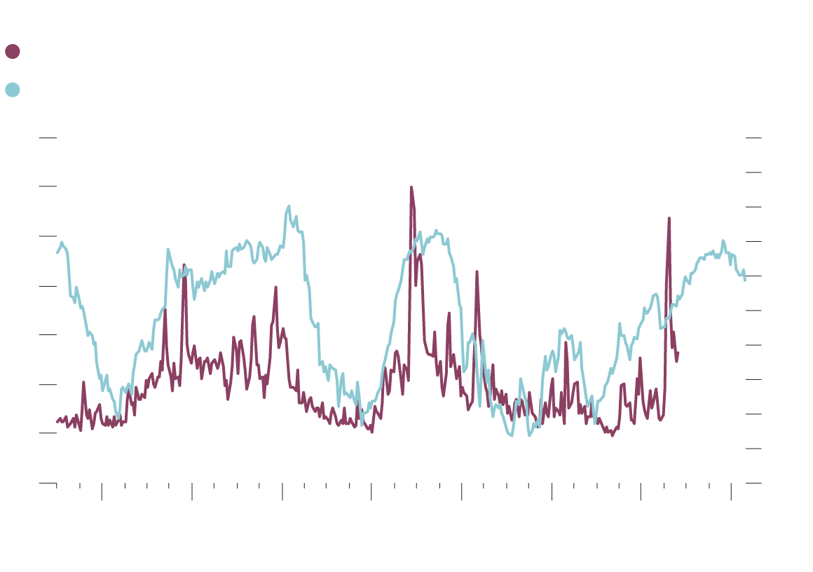 The premise is that the shape of the yield curve affects the VIX and market volatility with a three-year lag. It suggests that the VIX will remain elevated for at least the next 18 to 24 months (the purple line will, based on past trends, track the blue line higher).