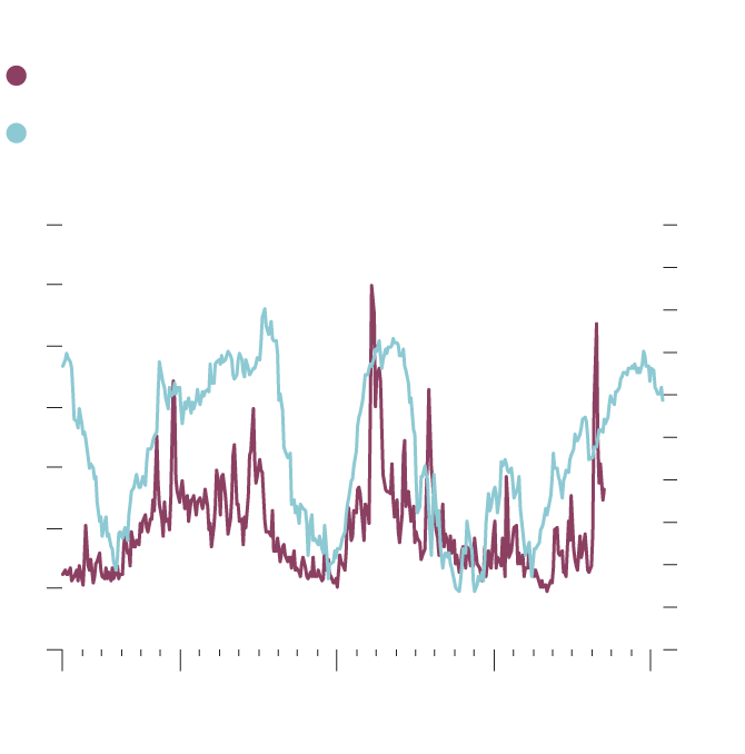 The accompanying chart depicts the close relationship between bond markets and the stock market volatility. The blue line represents the yield curve; note that the data are plotted inversely to better show the trend.