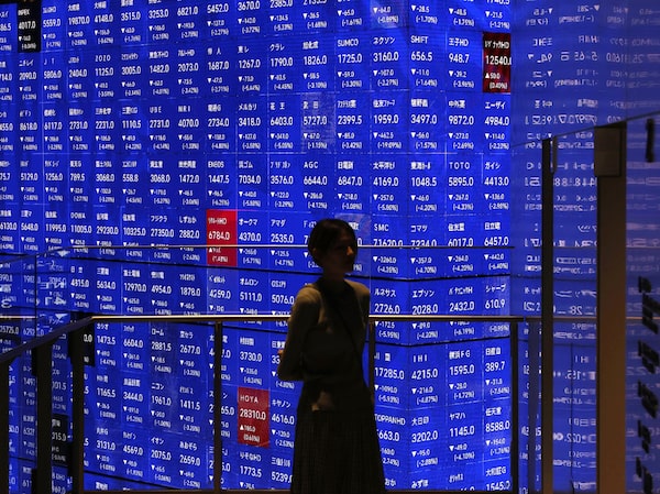 A person stands in front of an electronic stock board with Japan's stock prices in Tokyo Tuesday, March 3.Shingo Fukuma/The Associated Press