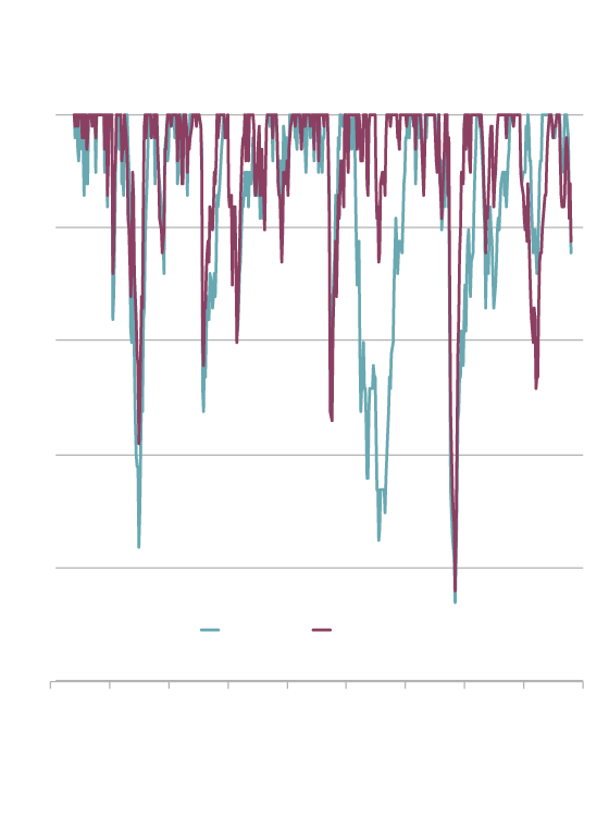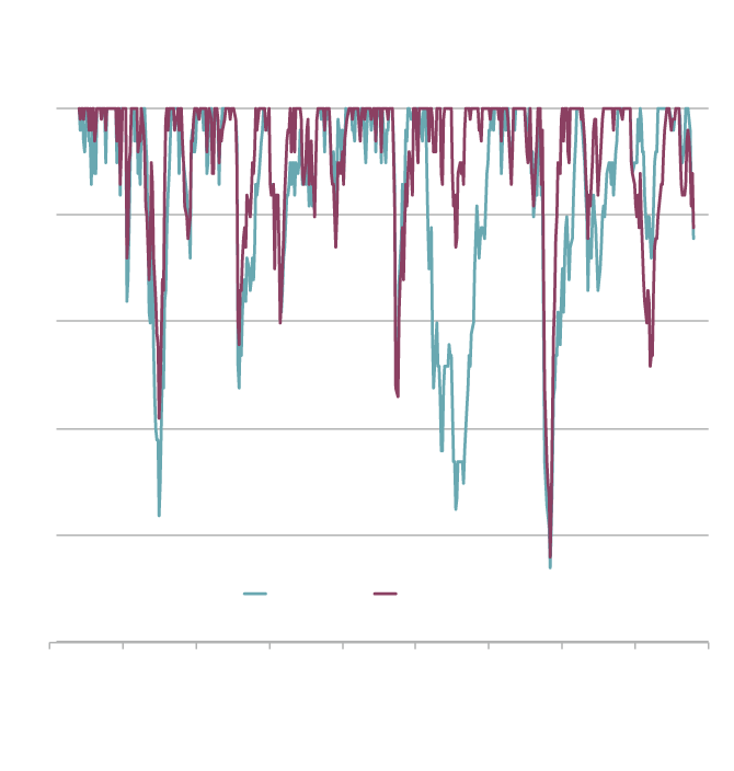 To explore the downside, I’m going to focus in on the high-yield portfolio and compare it with the market portfolio. The second graph looks at periods when the high-yield portfolio and the market fell from their prior peaks. (All of the return figures and calculations herein use monthly data. As a result, peak-to-trough declines would be larger when measured using weekly or daily data.)