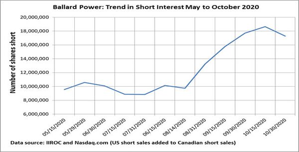 Hydrogen fuel-cell developer Ballard Power Systems Inc. (BLDP-T) has seen a doubling in its short position to nearly 18 million shares during the past six months. Over 90 per cent of the short position is on the NASDAQ and the rest is on the TSX. Ballard Power’s shares have gone parabolic during the past 12 months and now trade 160 per cent higher.