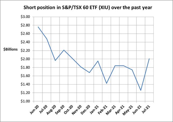 The short position in the iShares S&P/TSX 60 ETF has rocketed upwards during the month to July 15, reaching an estimated $2-billion. The spike seems to have been triggered by concerns over the surge in new variants of COVID-19 and the pressure that rising inflation is putting on the Federal Reserve to stop pumping stimulus.
