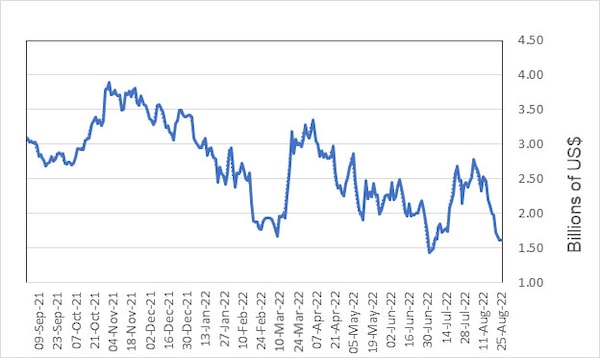 Short sellers were slightly less bearish on the direction of the TSX in August, as proxied by the short position in the iShares S&P/TSX 60 ETF (XIU-T). On Aug. 24, it stood at $2.3-billion, versus $2.5-billion in July. There was a 5.4-per-cent appreciation in XIU over the month, so short sellers closed some positions to cut losses or take profits.