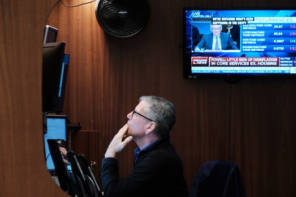 Traders work on the floor of the New York Stock Exchange (NYSE) as Federal Reserve Chair Jerome Powell speaks on Mar. 7 in New York City. Mr. Powell’s comments during a hearing in Washington rattled stocks, bonds and commodities.Spencer Platt/Getty Images