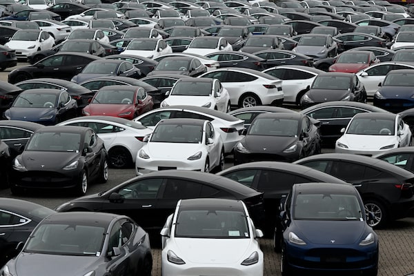Tesla electric cars are stationed in a storage area in the Zeebrugge port, northern Belgium on June 21, 2024. (Photo by JOHN THYS / AFP) (Photo by JOHN THYS/AFP via Getty Images)JOHN THYS/Getty Images