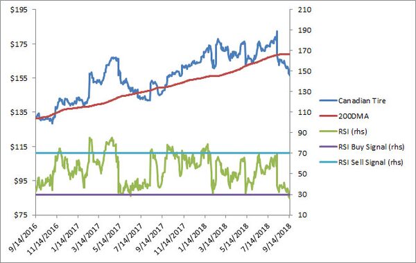 I picked Canadian Tire Corp. for the focus chart after it fell 2.6 per cent in the past week. The stock looks like a case where the 200-day moving average determines the reliability of RSI buy signals.
