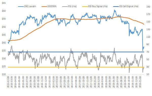 There are only two index members trading at technically attractive, oversold RSI levels below the buy signal of 30. Crescent Point Energy Corp. is the most oversold stock in the index, followed by SNC-Lavalin Group Inc.