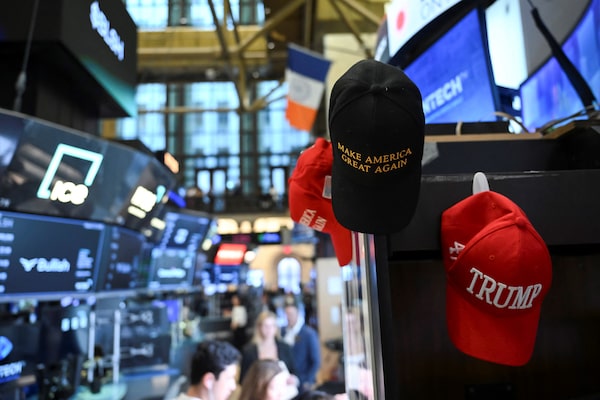 Pro-Trump hats are seen as traders work on the floor of the New York Stock Exchange during morning trading, on Aug. 13.ANGELA WEISS/AFP/Getty Images