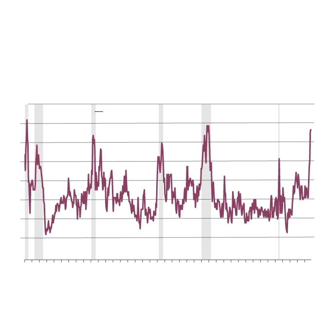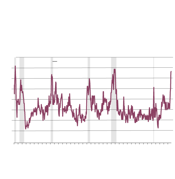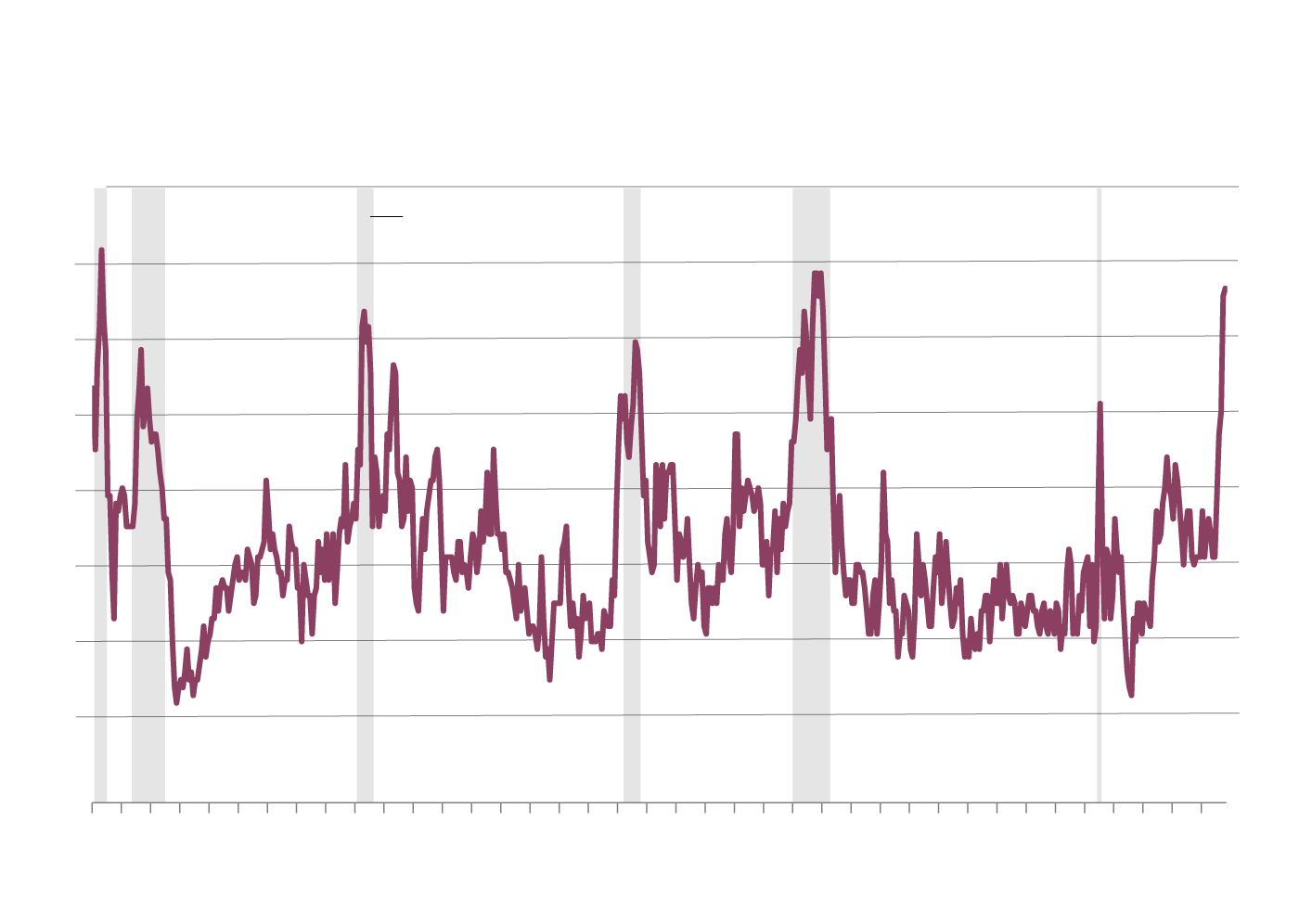 More and more Americans are concerned about losing their jobs. (Percentage of people expecting more unemployment over the next 12 months)