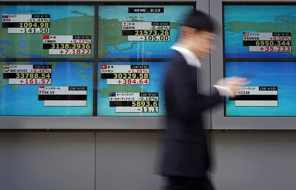 A man walks past an electronic stock board at a securities firm in Tokyo, on April 10, 2018.Eugene Hoshiko/The Associated Press