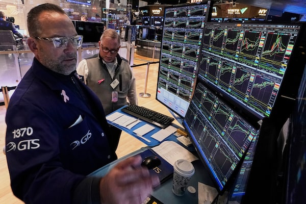 Specialist Anthony Matesic, left, and trader Michael Conlon work on the floor of the New York Stock Exchange, Wednesday, April 23, 2025.Richard Drew/The Associated Press