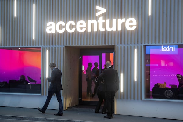 The logo of Irish services and consulting company Accenture is seen at an temporary office during the World Economic Forum 2022 in Davos, Switzerland.ARND WIEGMANN/Reuters