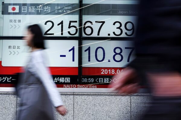 A woman walks past an electronic stock board showing Japan's Nikkei 225 index at a securities firm in Tokyo, on April 10, 2018.Eugene Hoshiko/The Associated Press