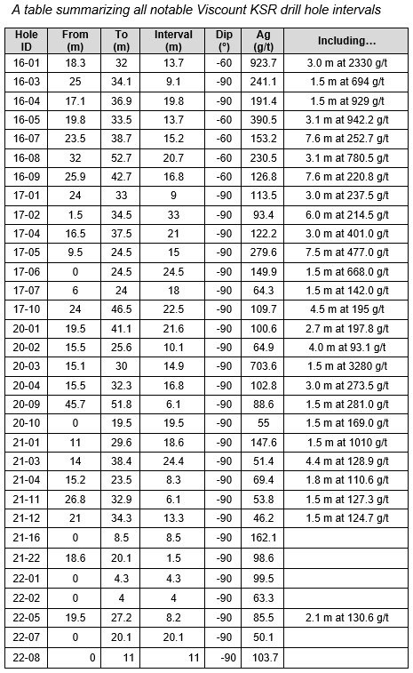 Throughout six drilling campaigns performed at the Kate, fifty-four drill holes were drilled by Viscount. Of these, twenty-five drill holes presented intervals assaying greater than 110 G/T and ten drill holes displaying intervals assaying over 400 G/T.