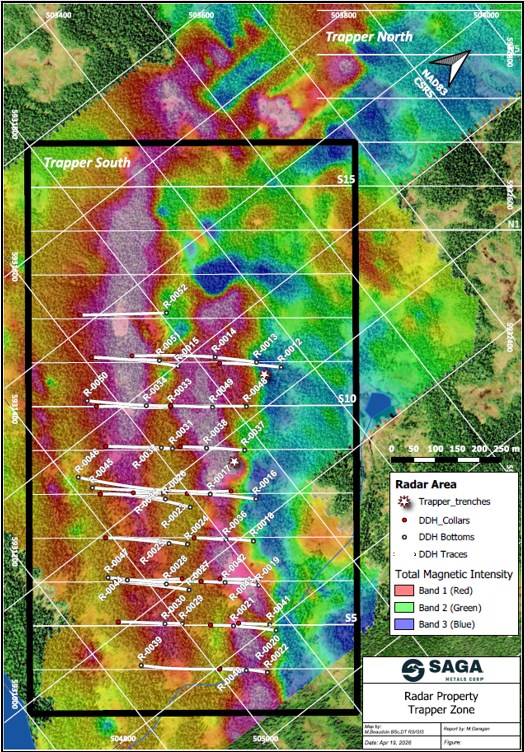 Vancouver, British Columbia--(Newsfile Corp. - April 21, 2026) - SAGA Metals Corp. (TSXV: SAGA) (OTCQB: SAGMF) (FSE: 20H) ("SAGA" or the "Company"), a North American exploration company focused on critical mineral discoveries, is pleased to report additional assay results from drill holes R-0024, -0025 and -0026 completed in 2026 as part of its ongoing maiden Mineral Resource Estimate ("MRE") diamond drill program at the Trapper Zone within the 100%-owned Radar Titanium-Vanadium-Iron Project near Cartwright, Labrador, Canada.