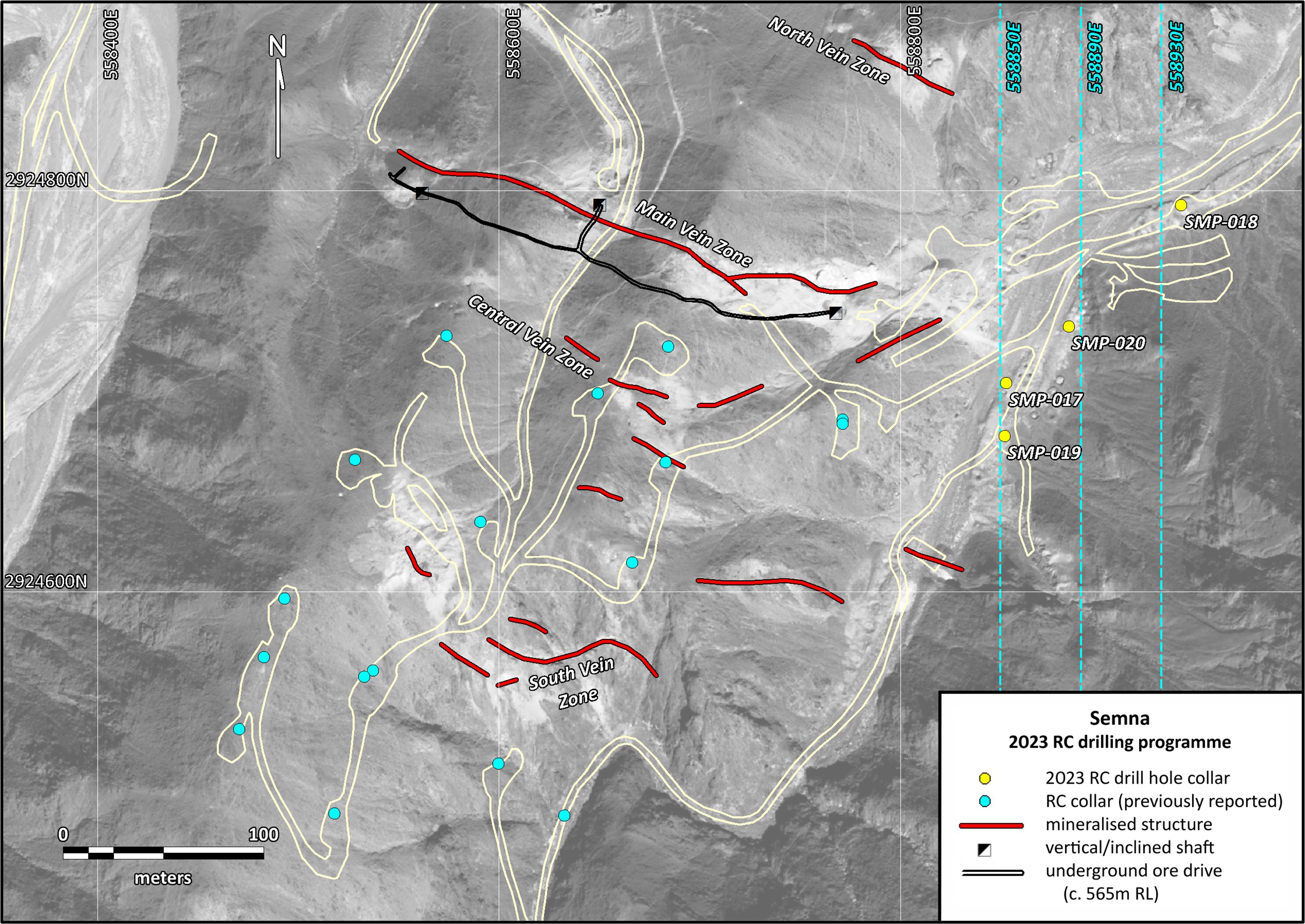| SMP-018 | 558939.8 | 2924792.9 | 567.0 | 140 | -52.0 | 342.7 | Main Vein zone (E extension) |