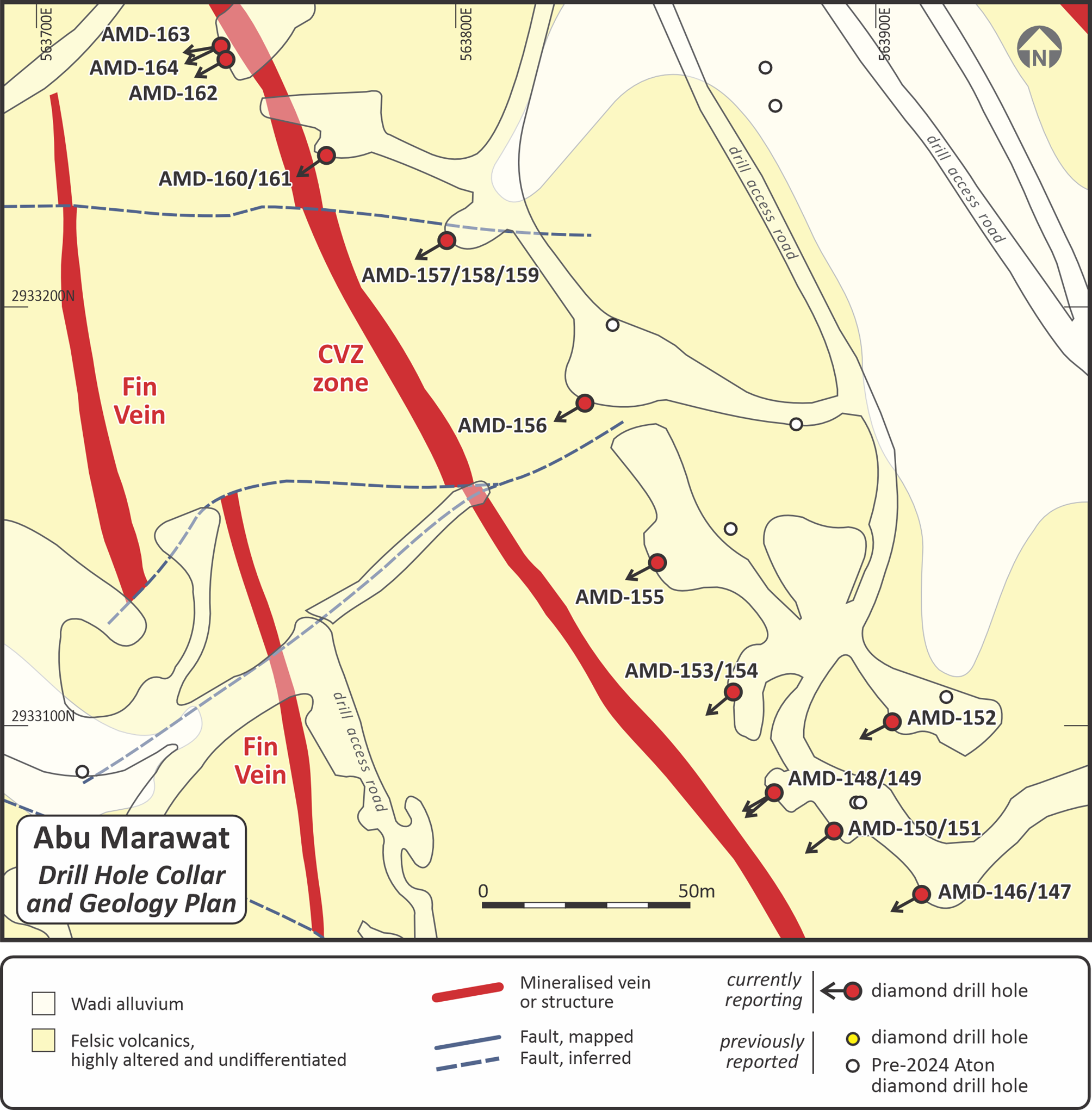 Figure 3: Geology and drill hole collar plan of holes targeting the CVZ and Fin Vein structures, AMD-146 to AMD-164
