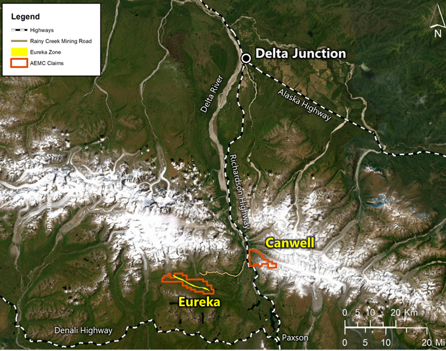 The Eureka deposit of the Nikolai project is situated approximately 80 kilometers (60 miles) south of the town of Delta Junction and 32 kilometers (20 miles) west of the Richardson Highway. The Rainy Creek Mining Trail leads from the Richardson Highway to present and past-producing alluvial gold mines at Rainy Creek and Broxson Gulch. AEMC proposes to rehabilitate the existing roadway, and to extend it approximately 8 kilometers (6 miles) from Broxson Gulch southward to the Eureka deposit. Additionally, a campsite is proposed. It is anticipated that the camp would house up to 100 company personnel and contractors. As part of the road project, temporary bridges would be placed to allow exploration vehicles and supplies to cross the Delta River and Eureka Creek.