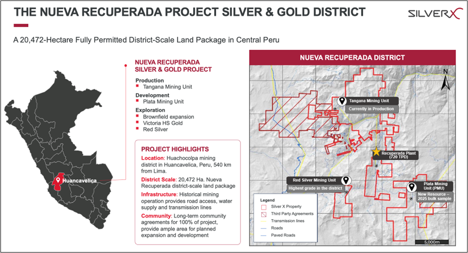 Silver X is a rapidly expanding silver producer and developer. The Company owns the 20,472-hectare Nueva Recuperada Silver Project in Central Peru and produces silver, gold, lead, and zinc from its Tangana Mining Unit. We are building a premier silver company that aims to deliver outstanding value to all stakeholders, consolidating and developing undervalued assets, adding resources, and increasing production while aspiring to sustain the communities that support us and stewarding the environment. Current production, paired with immediate development and brownfield expansion opportunities, presents investors with the opportunity to invest in the early stages of a silver producer with strong growth prospects. For more information visit our website at www.silverxmining.com.