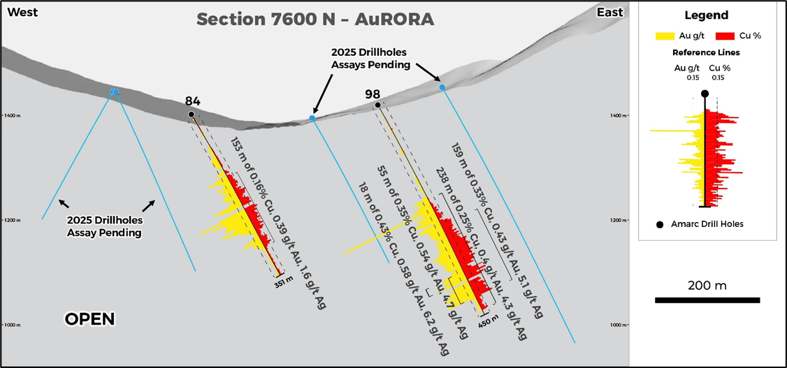Results announced in November from six holes completed on Sections 8000N and 8100N successfully expanded AuRORA +200 m to the north (see Amarc release October 22, 2025). Today, we are announcing two drill holes (JP25103, JP25109) located on Section 8200N, which have expanded AuRORA a further +100 m to the north (Figures 1, 2, 3 and 4, and Tables 1 and 2).
