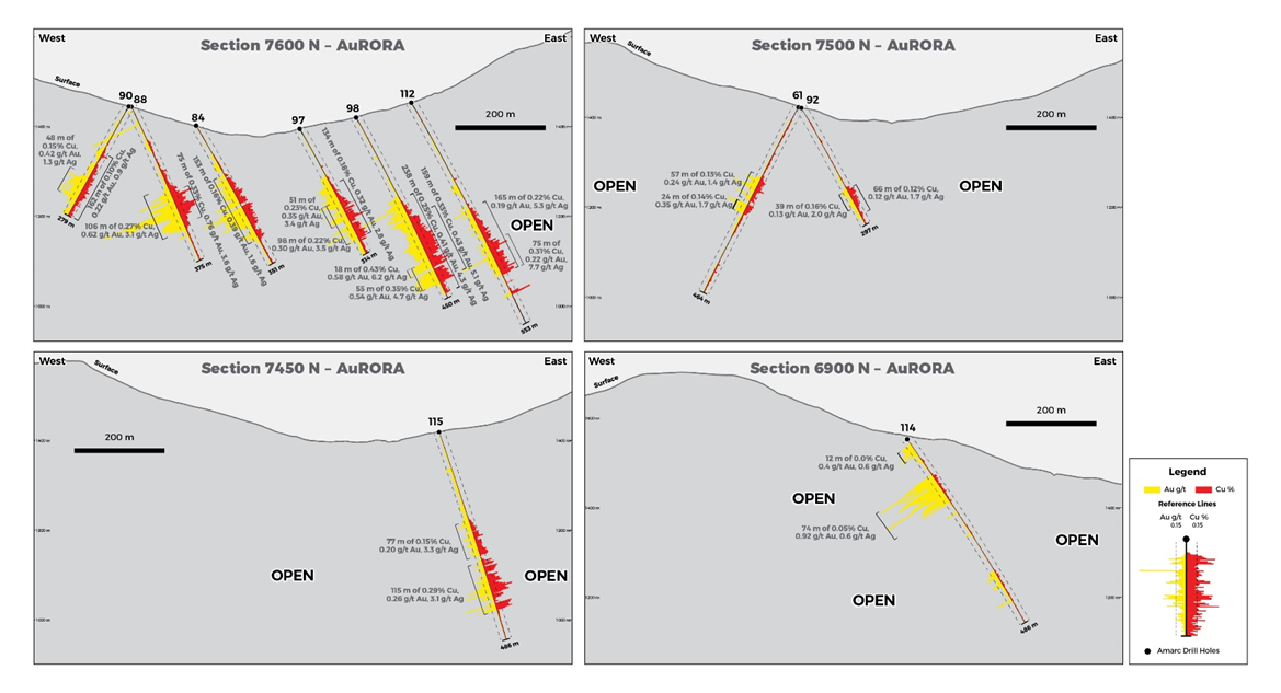 Figure 4 (Sections 7600N, 7500N, 7450N and 6900N): AuRORA Deposit Discovery 2025 Step-Out Drilling is Discovering More Open-Ended, Continuous Mineralization