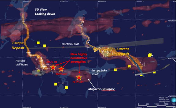 In the spring of 2025, the Company engaged an expert in Magnetotelluric (MT) geophysical surveys to reassess historical MT data for the extension target. The assessment identified three coincident magnetic and EM anomalies (Figure 2) that have strongly similar characteristics to the recently drill-confirmed high-grade 'ballroom' mineralization at the Current Deposit (see October 3, 2024 and April 15, 2025 News Releases). It also clearly identified the known mineralization at the Escape High-Grade zone, which provides additional confidence in these three targets.