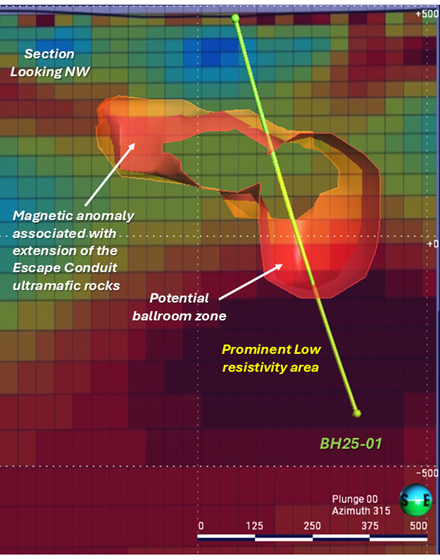 Figure 2. Location of newly identified 'ballroom-type' coincident magnetic and conductivity anomalies within the modelled down-plunge extension of the Escape Deposit.