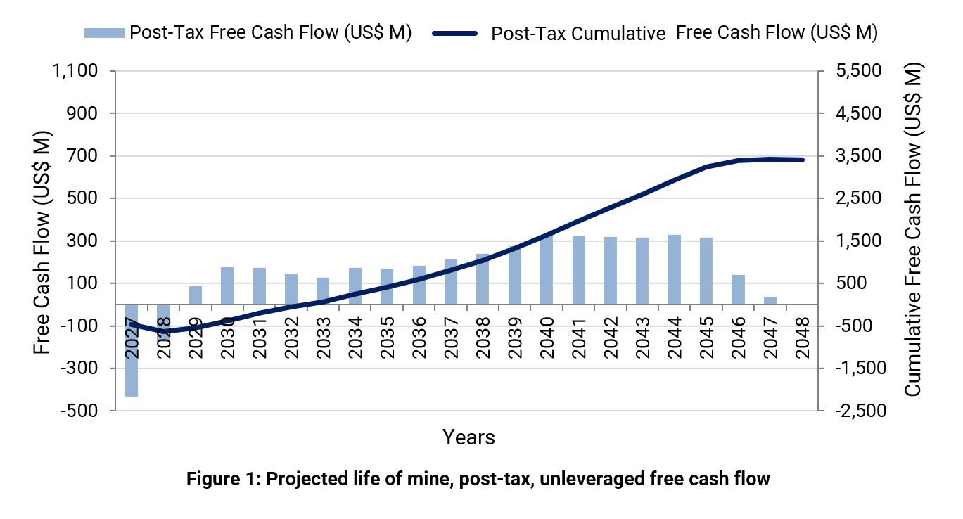 Figure 1 demonstrates the yearly and cumulative post-tax free cash flow generated through the LOM.