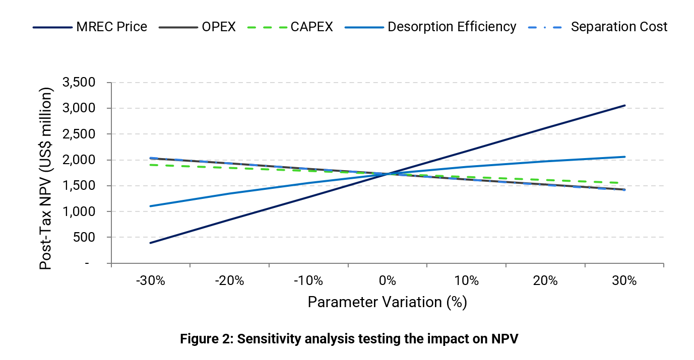 A sensitivity analysis was undertaken to evaluate the impact on after-tax NPV, considering a variation of ±30% for five key input variables: MREC sale price, Separation Cost, Desorption Efficiency, OPEX and CAPEX (Figure 2).
