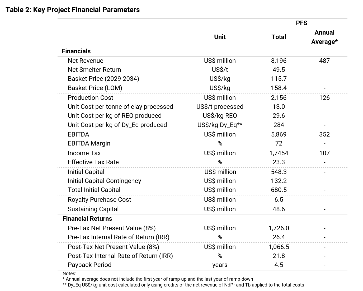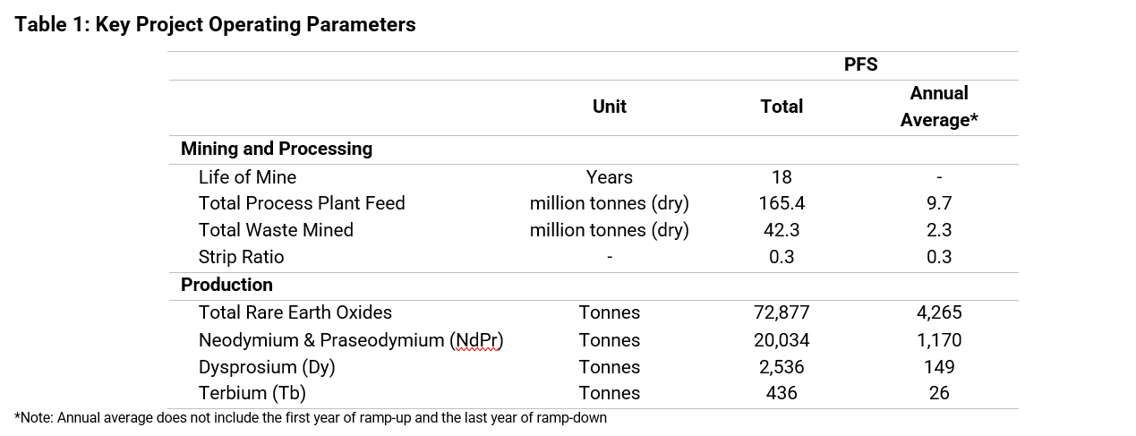 Table 1 and Table 2 summarize the relevant parameters associated with the PFS operating and financial metrics: