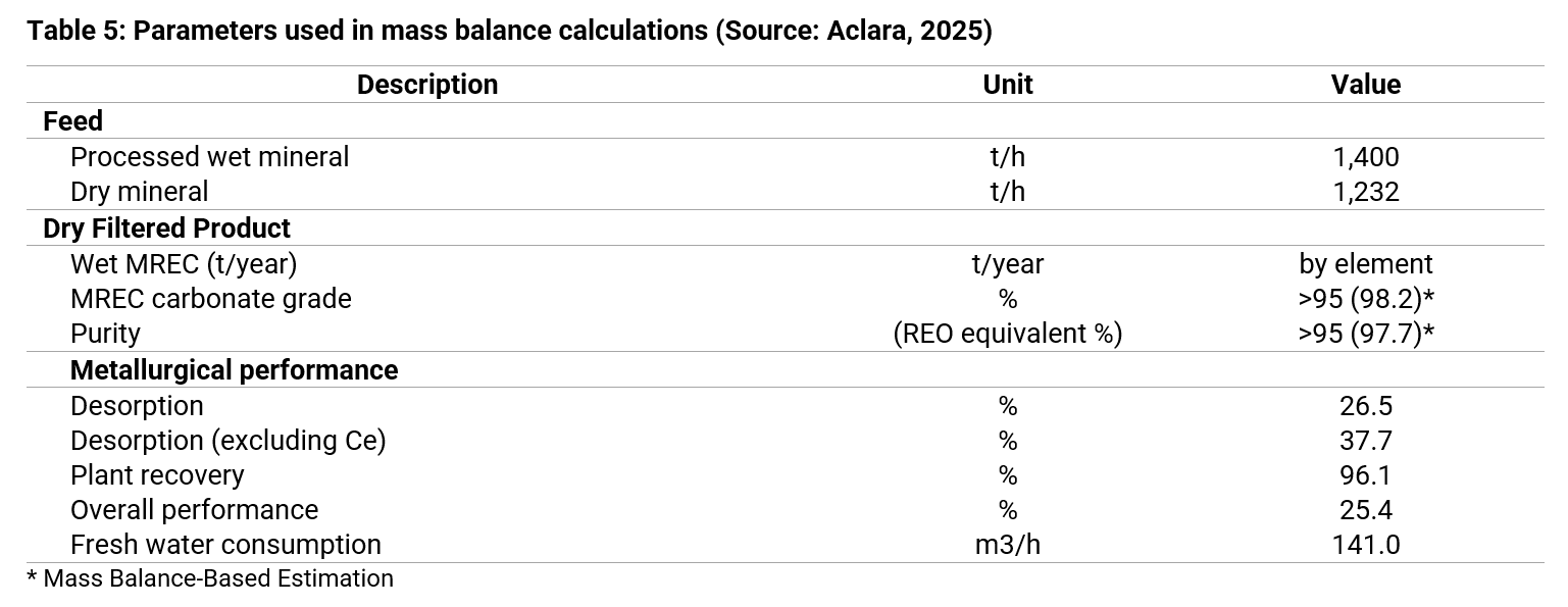 Before the clays exit the process plant, they are washed with clean water within standard plate-and-frame membrane filter presses. The wash removes any residual ammonium sulfate from the clays before they are returned to the deposition zone or used to back-fill the extraction zones for revegetation. Table 5 lists the key process design criteria used in the mass balance calculations.