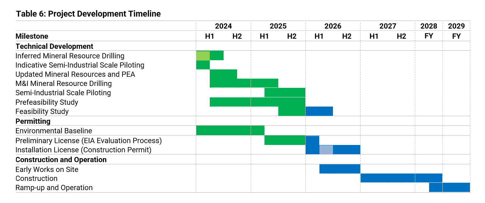 The permitting process is currently underway and the technical development is in progress with a feasibility study scheduled to be delivered in Q2 2026 and commencement of operations projected to begin at the end of 2028 (Table 6). The Company is evaluating the possibility to expedite the production schedule to begin by mid-2028.