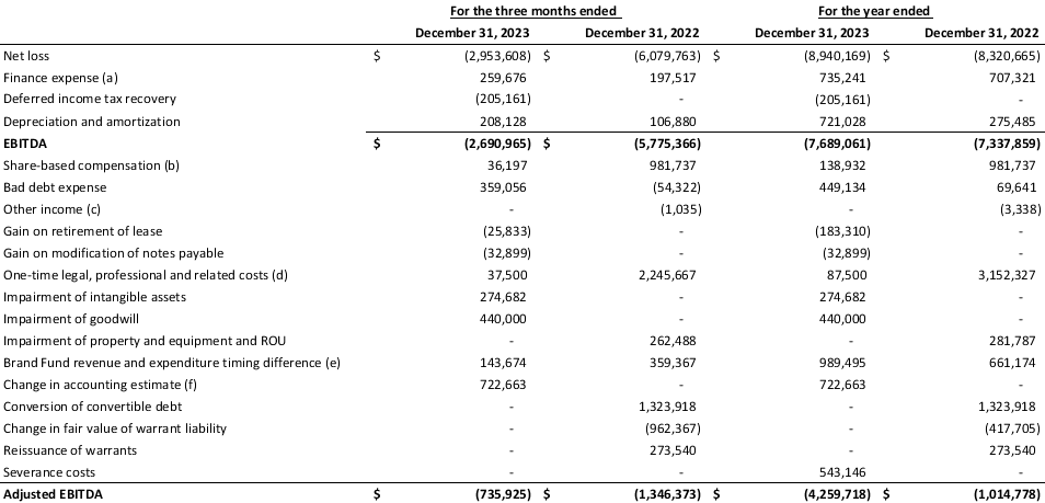 “Adjusted EBITDA” is comprised as income (loss) less interest, income tax, depreciation, amortization, share-based compensation, Brand Fund revenue and expense timing difference, change in fair value of warrant liability, foreign exchange gain (loss) and other income / expenses not attributable to the operations of the Company. Management believes that EBITDA is a useful indicator for investors, and is used by management, in evaluating the operating performance of the Company. See “Consolidated EBITDA and Adjusted EBITDA Reconciliation” appended to this press release for a quantitative reconciliation of Adjusted EBITDA to the most directly comparable financial measure.