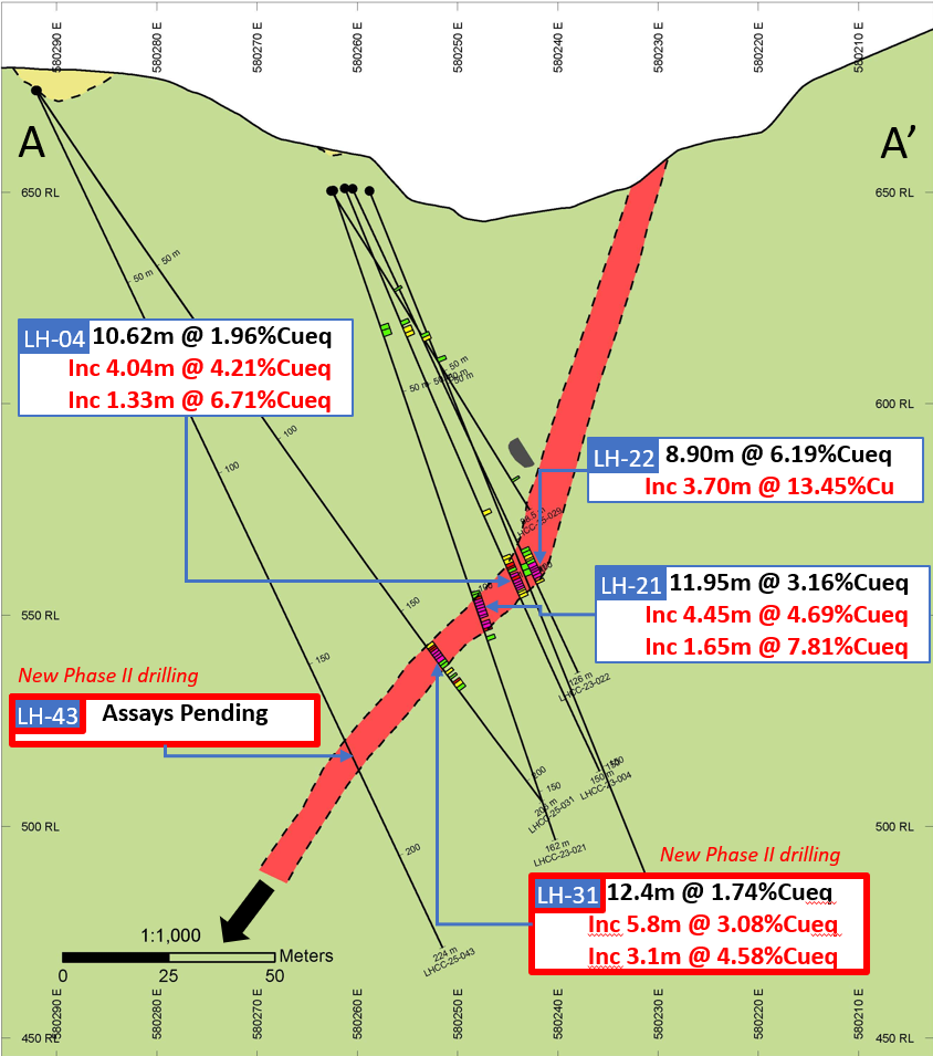 FIGURE 1: CROSS SECTION HIGHLIGHTED BY LHCC-25-031 AND LHCC-25-043 (ASSAYS PENDING) DOWN DIP RESULTS