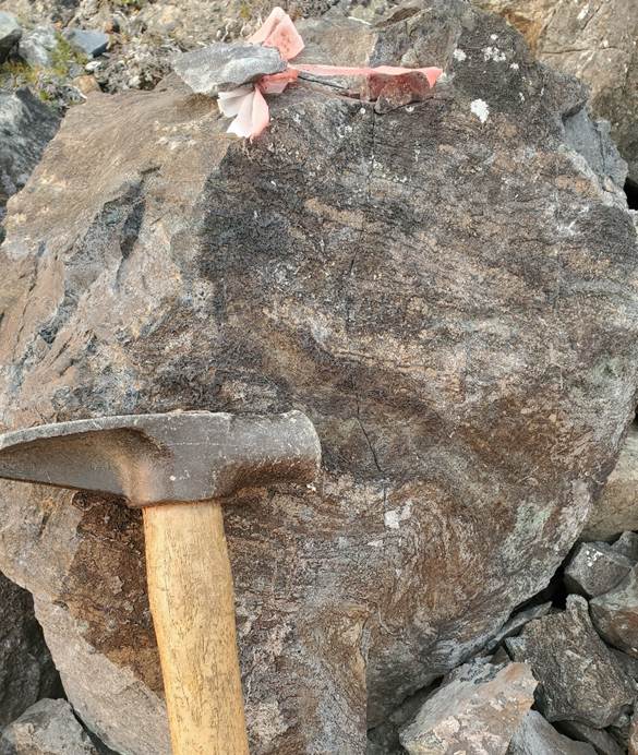 Historical flagged sample of organic-rich dolomite boulder at CBC Showing