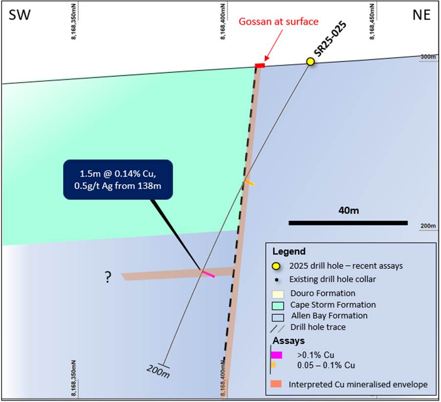 Drill hole SR25-029 was completed along strike to the west of the known mineralization and intersected 3m @ 0.8%, 1.5g/t Ag Cu from 76.2m.