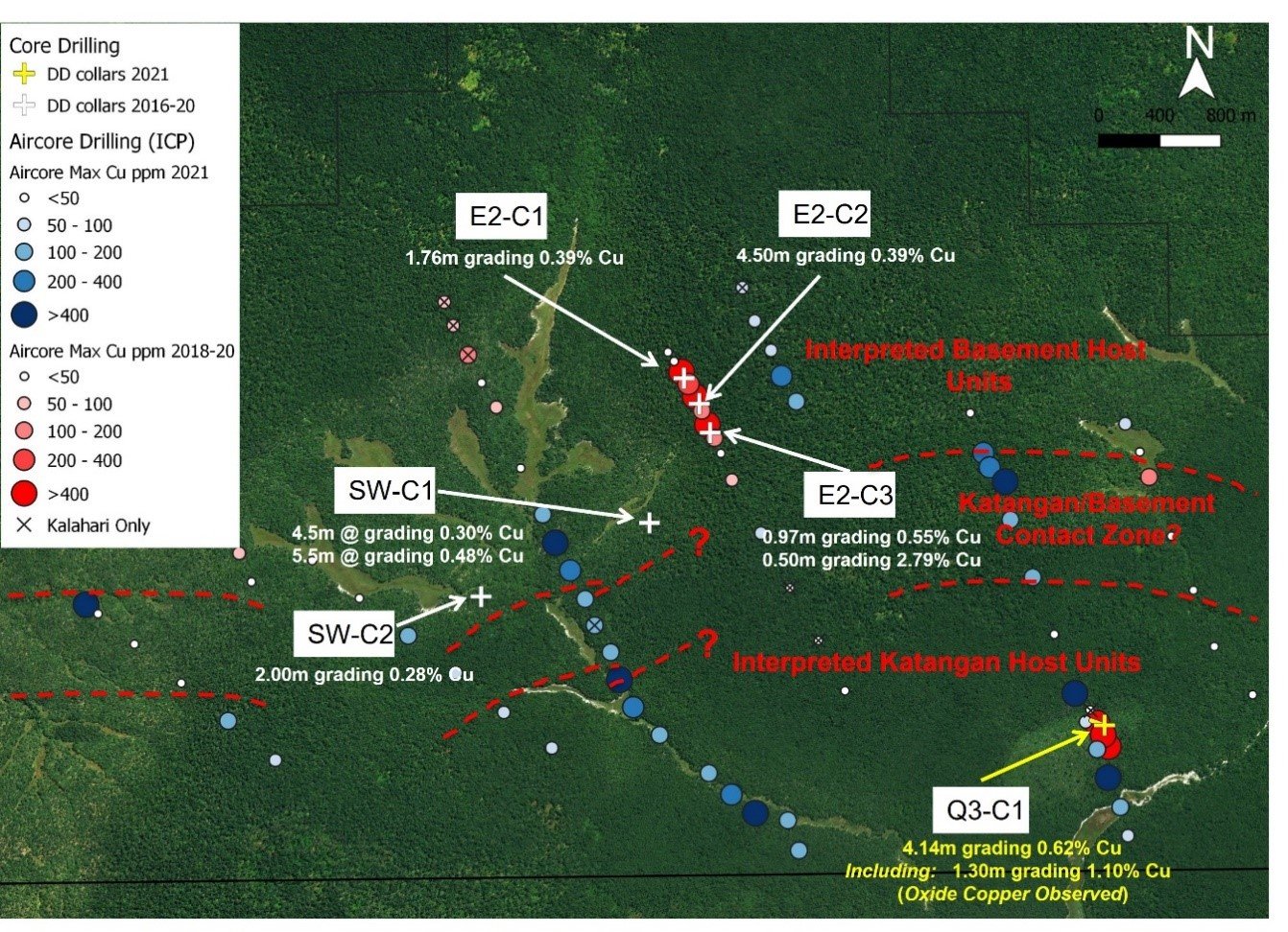 The intersection of 4.14 metres grading 0.62% Cu (from 92.36 metres drilled depth) is of specific interest as this zone of observed copper oxide mineralization in drill hole Q3-C1 is hosted within siltstones interpreted to be part of the Katanga Supergroup. These siltstones have been intersected in relatively close proximity to what is currently interpreted to be basement hosted copper mineralization at the SW-Prospect (See Figure 2). Many of the world class, sediment-hosted, copper deposits and mines of the Central African Copperbelt occur in this type of geological setting when coupled with favourable structural feeders for the copper mineralization.