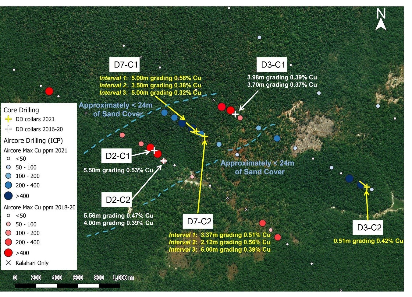 In 2021 the Company completed 1,382 metres of core drilling in six holes, 4,353 metres of shallow aircore, and a helicopter-borne electromagnetic ("EM") survey over the Project. The interpretation of the EM survey data was integrated with previous geophysical and geological interpretations of the Property. The EM data improved exploration target selection and mapping of the Kalahari sand cover units. Four priority targets were identified from the aircore program for testing with core drilling. These were related to both the D-Prospect and two standalone new exploration targets, namely the Q and F targets (See Figure 1). The core drilling program was completed in early December and the analytical results were recently received. Table 1 provides details of the drilled copper intersections from the core drilling and Table 2 provides the collar location, azimuth and dip information.