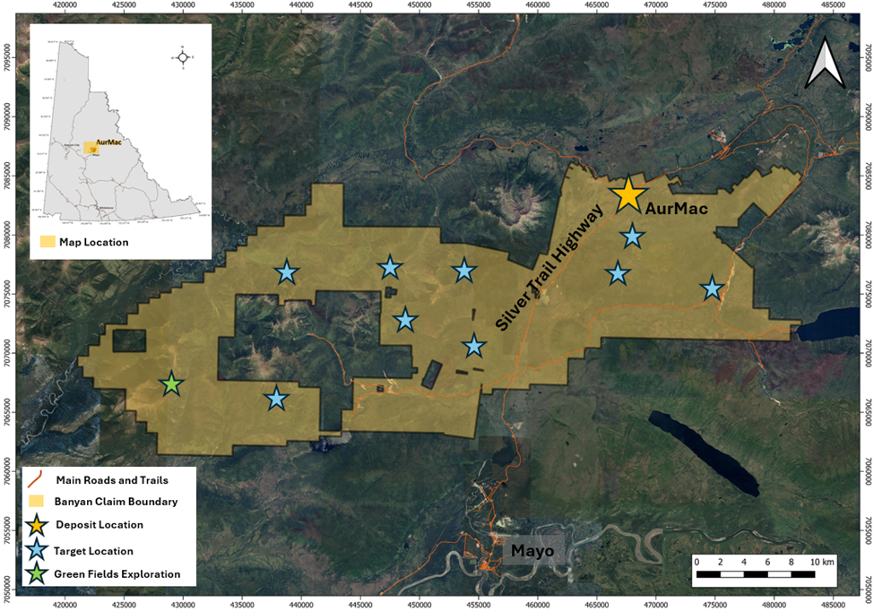 Banyan's primary asset, the AurMac Project is located in the Traditional Territory of First Nation of Na-Cho Nyäk Dun, in Canada's Yukon Territory. The current Mineral Resource Estimate ("MRE") for the AurMac Project has an effective date of June 28, 2025 and comprises an Indicated Mineral Resource of 2.274 million ounces of gold (" Au ") (112.5 M tonnes at 0.63 g/t) and an Inferred Mineral Resource of 5.453 Moz of Au (280.6 M tonnes at 0.60 g/t ) (as defined in the Canadian Institute of Mining, Metallurgy and Petroleum ("CIM") Definition Standards for Mineral Resources & Mineral Reserves incorporated by reference into NI 43‑101). The 303 square kilometres ("sq km") AurMac Project lies 40 kilometres from Mayo, Yukon. The AurMac Project is transected by the main Yukon highway and benefits from a 3-phase powerline, existing power station and cell phone coverage.