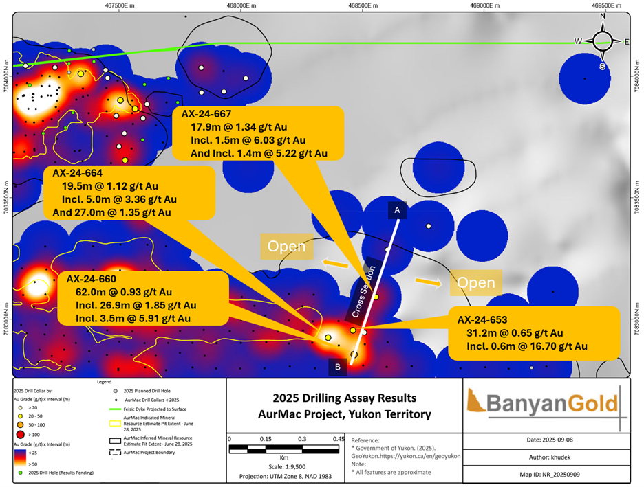 VANCOUVER, BC / ACCESS Newswire / September 15, 2025 / Banyan Gold Corp. (the "Company" or "Banyan") (TSX-V:BYN)(OTCQB:BYAGF) is pleased to announce it has intersected multiple instances of visible gold in sheeted veins at the Powerline deposit ("Powerline") at its AurMac Project ("AurMac") in the prolific Tombstone Belt, Yukon, Canada. High-grade Gold ("Au") in drillholes AX-25-660, 664, and 667 highlight the potential for further high-grade gold intervals in Powerline and confirm new 3D modelling mineralized domains. These holes also highlight the potential infill drilling to convert waste blocks to ore blocks with improved continuity of high-grade mineralized domains extending beyond the current Mineral Resource Estimate ("MRE") (see Table 3 below) conceptual pit boundary (Figure 1; Tables 1 and 2). To date, over 29,000m (127 holes) have been drilled by the Company this year on the AurMac Project, with drilling currently ongoing.