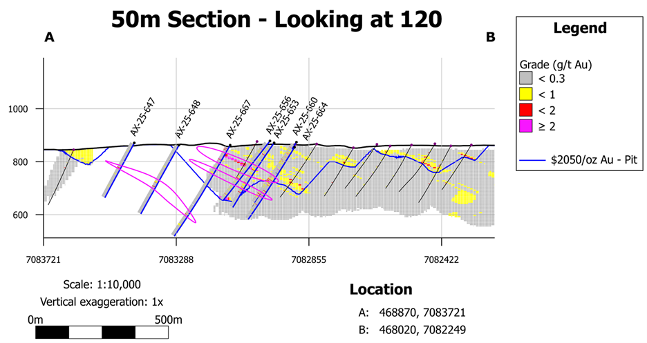 AX-25-660 - 1.85 g/t Au over 26.9m including 5.91 g/t Au over 3.5m,